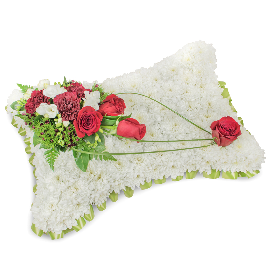 Convey your deepest condolences with our stunning bouquet, artfully crafted with a harmonious blend of white chrysanthemums, vibrant red roses, delicate white freesias, and elegant dark red carnations. Enhanced by charming dianthus and graceful bear grass, this arrangement stands as a unique and beautiful tribute.
